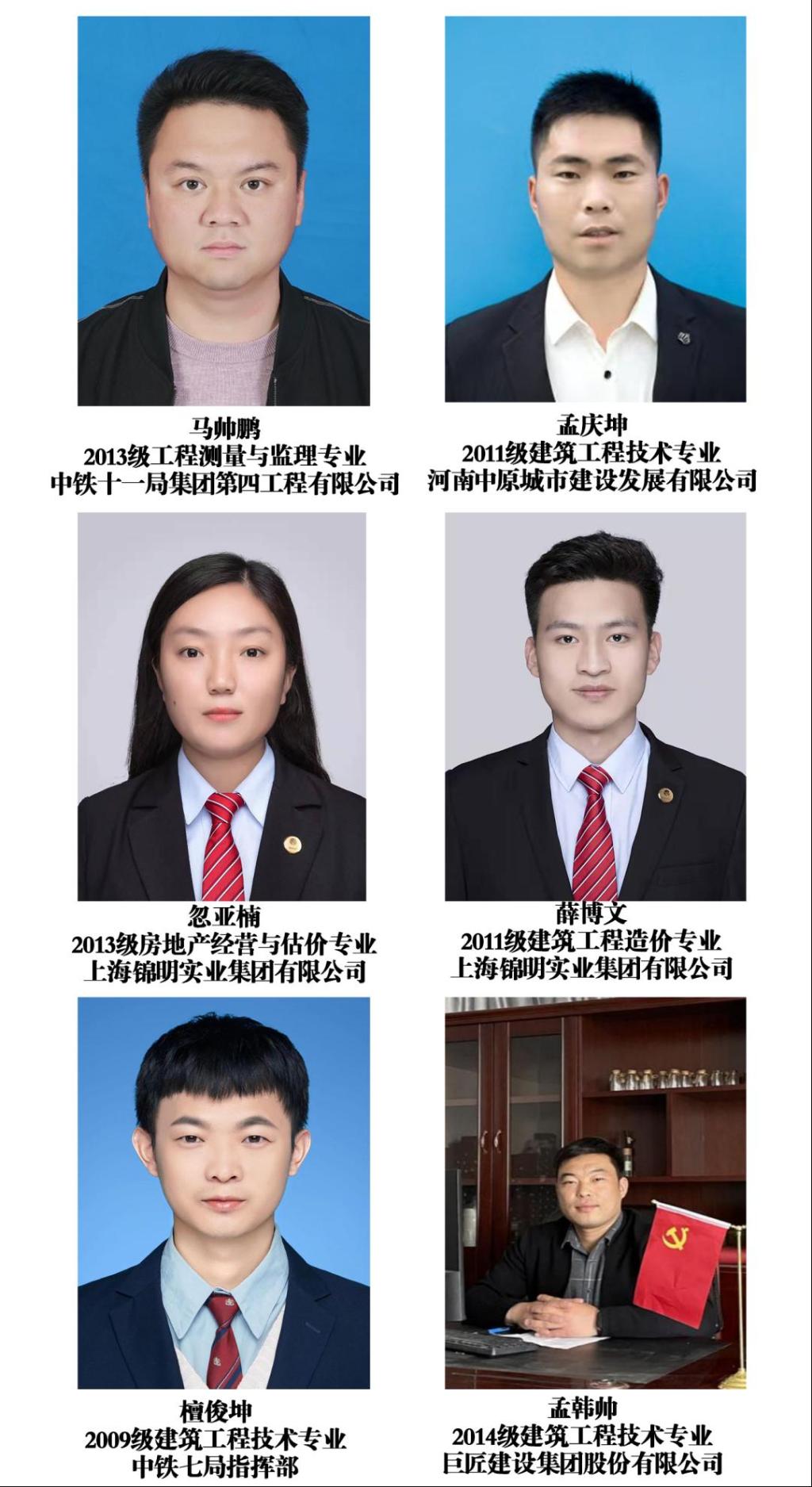 如2013级工程测量与监理专业马帅鹏同学,2015年7月进入中铁十一局集团第四工程有限公司,先后参与了多个公司重大项目的建设,从测量员到测量队长、从技术员到现在的项目总工,一步一个脚印,利用自身优秀的专业素养,跻身公司管理层。2011级建筑工程技术专业孟庆坤,2013年进入河南中原城市建设发展有限公司,先后任职见习生、技术主管、商务主管、分公司负责人、项目经理,现任公司总经理、高级经济师、工程师。2002级房建专业石绍中,现任职于苏州迈为科技股份有限公司,高级工程师,项目经理,主持多个重大建筑项目。2009级建筑工程技术专业檀俊坤,先后升入河南理工大学攻读硕士,中南大学攻读博士,目前任中铁七局指挥部副总工。2014级建筑工程技术专业韩帅,现任职于巨匠建设集团股份有限公司,技术总工。2014级建筑室内设计专业胡兴建,毕业后一直从事建筑装饰装修方面的工作,2019年自己创立公司南阳市壹诺实业有限公司,做了近千家家装项目,荣获众多奖项。