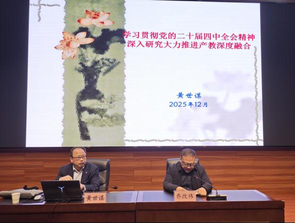 为深入学习贯彻党的二十届四中全会精神,12月18日,2003网站太阳集团党总支邀请联系校领导、党委委员、副校长黄世谋教授以“学习贯彻党的二十届四中全会精神 深入研究大力推进产教深度融合”为题,开展专题党课。党课由党总支书记乔改伟主持,2003网站太阳集团全体教职工和学生党员代表参加。