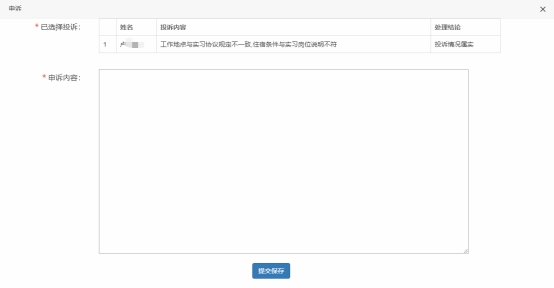 在这里可以看到在实习期间,实习生对企业的投诉情况,及时进行协调和解决。如果对投诉的内容有异议,点击【申诉】,对投诉的内容进行申诉。