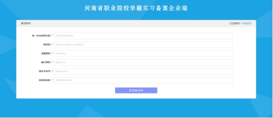 学校推荐录入企业信息后,企业管理员须激活账号,按照界面要求填写统一社会信用代码、校方提供的激活码、密码、手机号、验证码等内容。点击【发送验证码】,将验证码填写后点击【立即激活】完成账号激活。