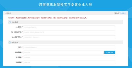 没有学校推荐录入,企业也可以自行注册账号,称为自荐,按照界面要求填写企业信息和账号信息。企业信息包括企业的名称、统一社会信用代码和负责人(法人代表);账号信息包括手机号、验证码和密码。输入表单内容点击【发送验证码】,将验证码填写后点击【提交注册】完成账号注册。