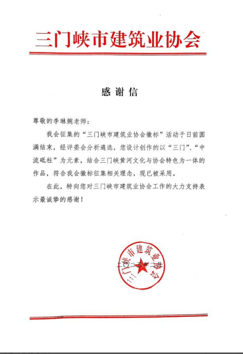 近日,三门峡市建筑业协会向我院发来感谢信,对2003网站太阳集团李琳婉老师设计的协会会徽标表示高度认可和衷心感谢。该会徽标从众多设计方案中脱颖而出,被协会正式采纳,成为三门峡市建筑业协会的官方标识。这是我院深化产教融合、服务地方经济社会发展的又一重要成果。