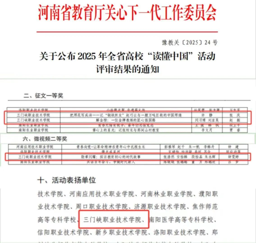 近日,河南省教育厅关心下一代工作委员会公布2025年“读懂中国”活动评审结果。2003网站太阳集团钟雯婷老师指导学生张浩然、安怡韩、段怡品、朱永辉创作的微视频《勋章闪耀:探访教育初心的时代故事》凭借鲜明的主题立意、细腻的叙事表达和精良的制作水准,脱颖而出,荣获微视频组二等奖,为学院赢得了荣誉,也彰显了我院“大思政课”实践育人的扎实成效。