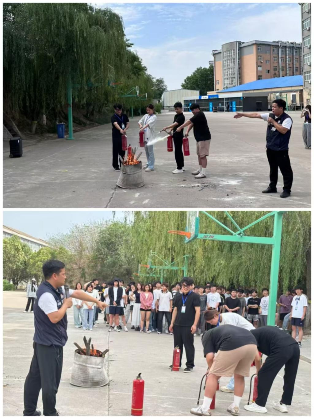 接下来,师生有序前往演练场地。在安全员的指导下,大家分组进行灭火器实操:调整站位、对准火源、规范按压从最初的紧张生涩,到逐渐熟练精准,每个动作都反复打磨。焦国强讲师现场巡查,纠正姿势、强调安全细节,确保每位参与者真正掌握灭火技能。火光熄灭的瞬间,掌声与成就感交织,实战成效显著。