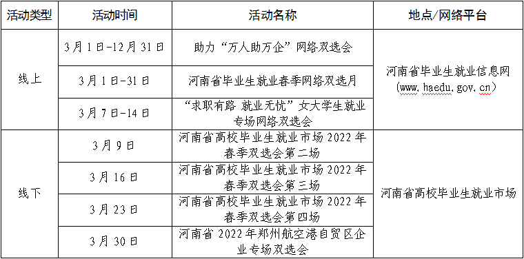 为促进我省2022届高校毕业生更加充分更高质量就业,服务地方经济社会发展,助力“万人助万企”活动开展,河南省高校毕业生就业市场3月份将举办7场双选会,诚邀广大用人单位及毕业生参加!